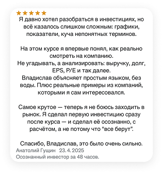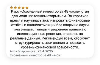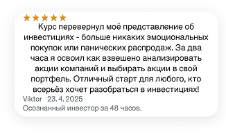 Интенсивная программа из 8 уроков, которая даст вам чёткое понимание, как находить компании с реальной ценностью и принимать решения, ведущие к прибыли и финансовой свободе - на основе фактов, а не слухов и новостей.