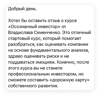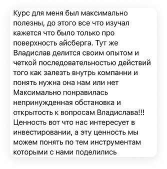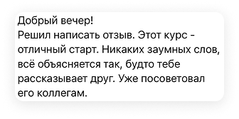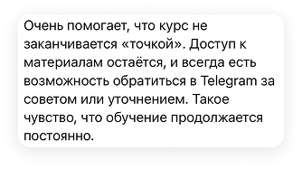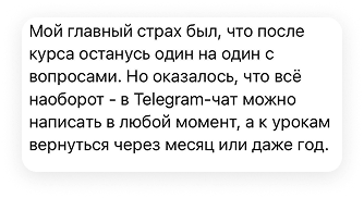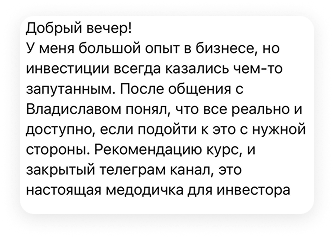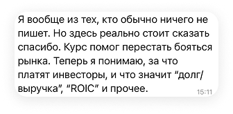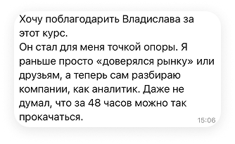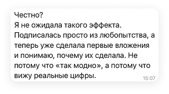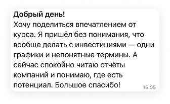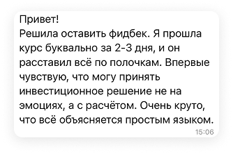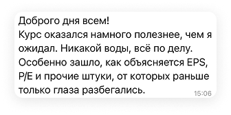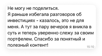 Поддержка,общение с другими участниками курса в Telegram. Делимся опытом, обсуждаем акции, не даём перегореть или запутаться